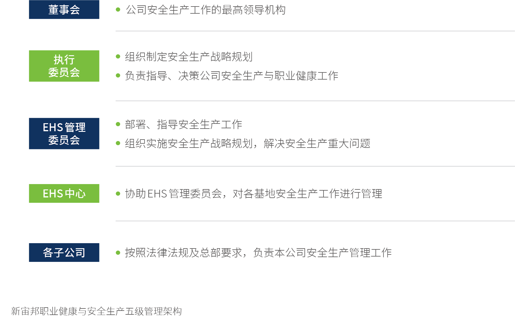 公司严格遵守《中华人民共和国安全生产法》等法律法规,构建“董事会—执行委员会—EHS管理委员会—EHS中心—各子公司”五级管理架构,为生产经营全过程、全链条、全生命周期的本质安全提供坚强的组织保障。