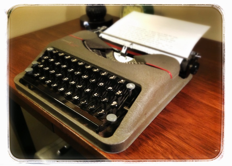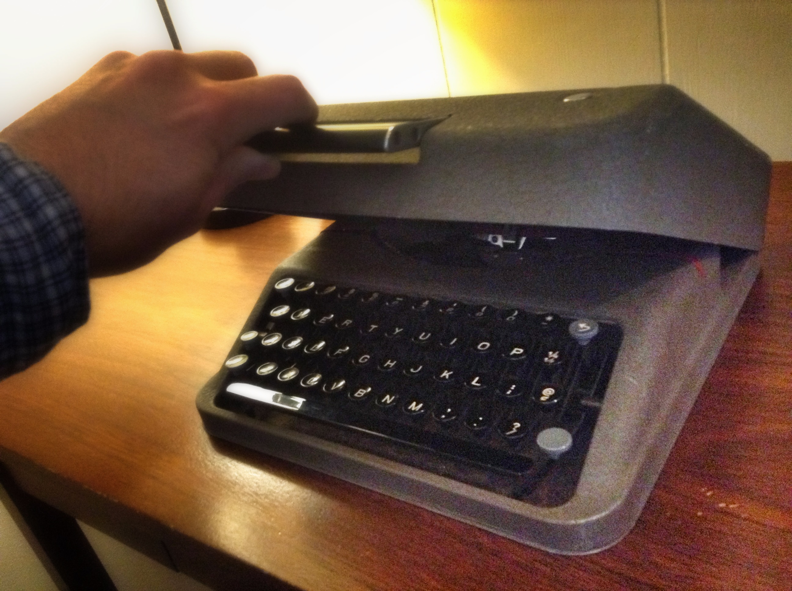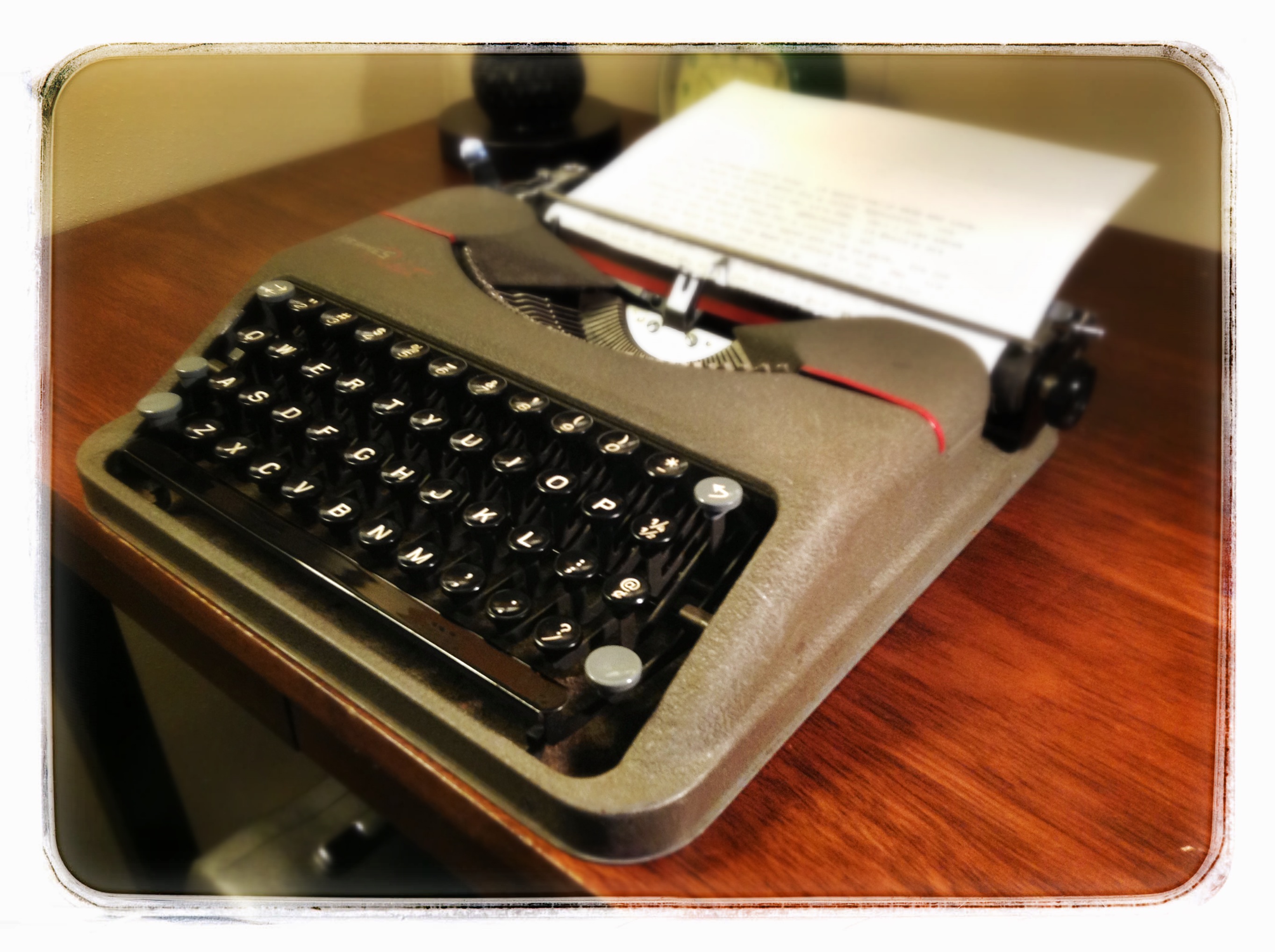 The nifty little typewriter in this review originated in 1941 and was passed down to a granddaughter from a grandfather who served in World War II. I can see this little typewriter rumbling over the fields of northern France and Belgium in the back of a Willy Jeep.  This is a field reporters machine. It’s got all the looks of military issue ordnance. This typewriter is small and could easily fit in your rucksack. And with an all steel, snap-on cover, it’s ready for a jaunt to the coffee shop or in a saddle bag slung across a camel’s back for a trek across the Sahara.
